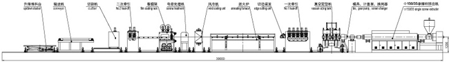 PC陽(yáng)光板設(shè)備由擠出機(jī)、快速換網(wǎng)裝置、模具、定型臺(tái)、一次牽引機(jī)及切邊裝置、熱烘箱、覆膜裝置、二次牽引機(jī)、切割裝置、輸送機(jī)、料架等組成。中空板擠出線特備配備的定型機(jī)和退火爐,其特點(diǎn)如下:真空定型臺(tái)的耐磨性、除塵性、定型性,使其更容易操作;高速螺桿,高旋轉(zhuǎn)速度匹配減速泵和穩(wěn)定壓力的低能耗消耗;擠出量高于其他品牌的25%,原因是其定型板的特殊設(shè)計(jì);定型板的冷卻系統(tǒng)和真空系統(tǒng)的獨(dú)特設(shè)計(jì)保證高速度的擠出定型;特殊的退火爐設(shè)計(jì),相比其他品牌的擠出線更容易控制,板材的平整度;牽引輥的柔軟度按客戶的要求設(shè)計(jì);中空板的空氣容量和低壓要進(jìn)行調(diào)整并容易操作;特殊模塊是由模具專門(mén)為PC陽(yáng)光板設(shè)計(jì)的。產(chǎn)品的雙壁厚度范圍要在2mm到10mm之間。雙壁之間的棱要成直角和對(duì)角線形狀; 抗UV共擠層可以單面可以雙面,根據(jù)結(jié)構(gòu)要求外表層要進(jìn)行噴砂處理或光滑處理。高比例可回收薄片可以和原材料混合一起。