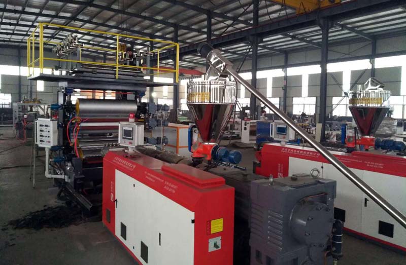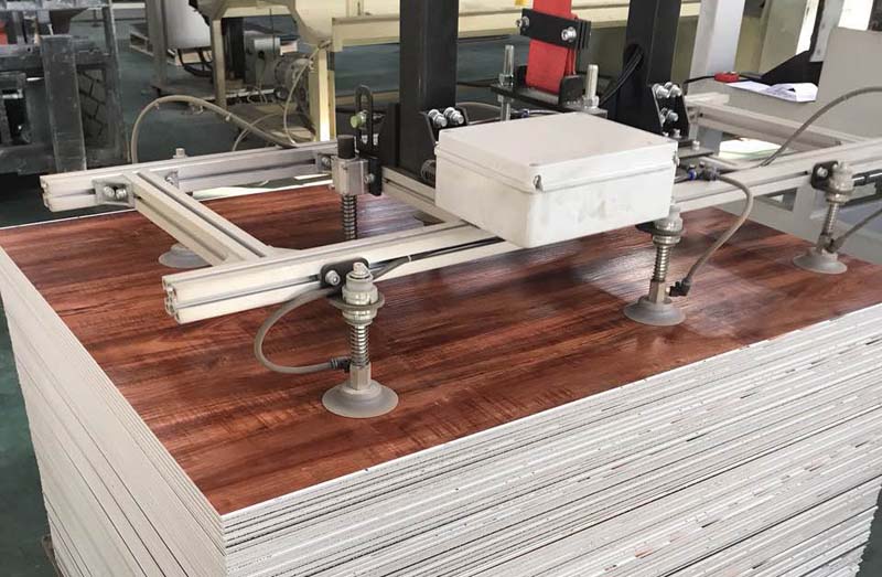 PVC石塑地板四輥加一輥生產線設備,擠出基材,熱敷彩膜裝飾層和耐磨層,實現(xiàn)一步法,在同一臺設備上同時完成。第一,表面可熱敷上各種不同顏色的彩膜裝飾層;第二,可直接在板材裝飾層上熱敷耐磨層;第三,可直接做上各種各樣浮雕木紋及各式各樣的花紋;第四,底層軟墊消音層,也可直接熱敷上去。以上四條均可同時在一條生產設備上完成多層結合為一體。可減少表層處理花紋,耐磨的設備。減少人工及設備的投資,大大降低PVC地板生產成本。